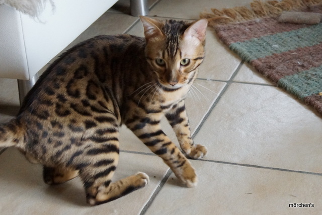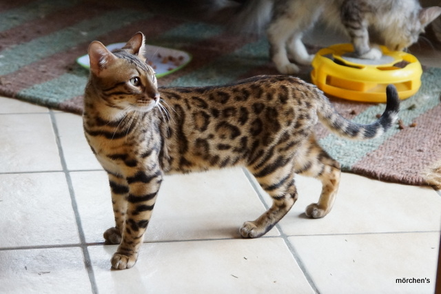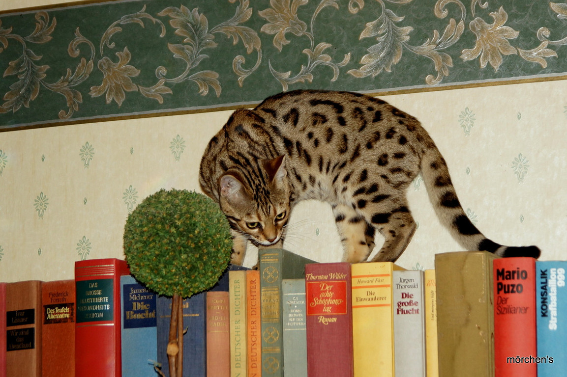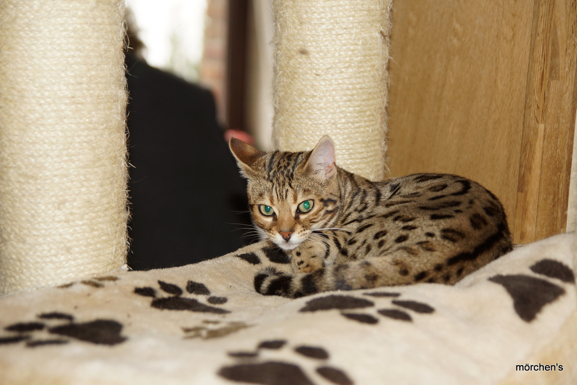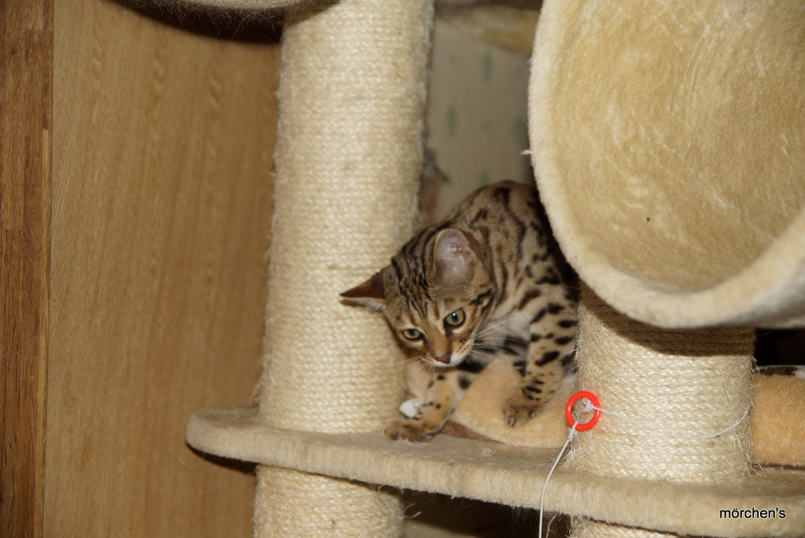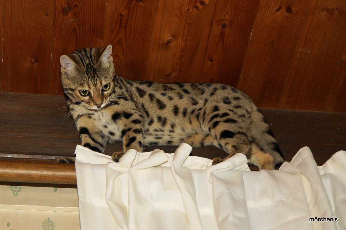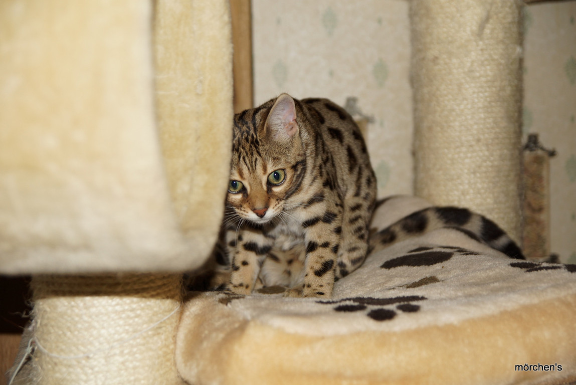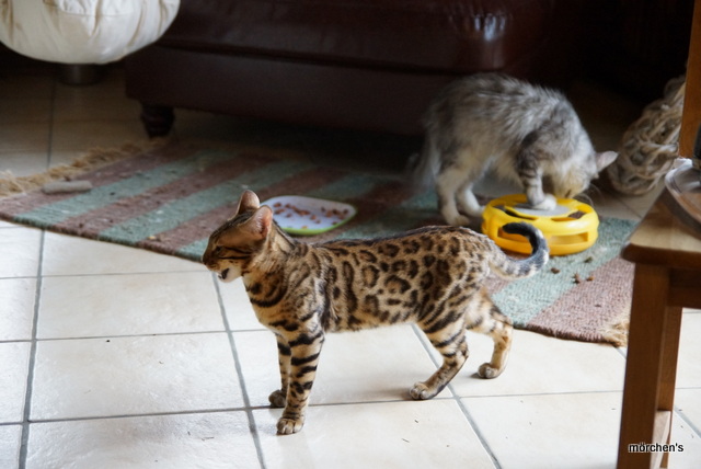 Unsere Fondation Bengalkatze F4 ist im Alter von 14 Wochen zu uns gekommenund. Sie lebt und spielt mit den anderen Hauskatzen zusammen.