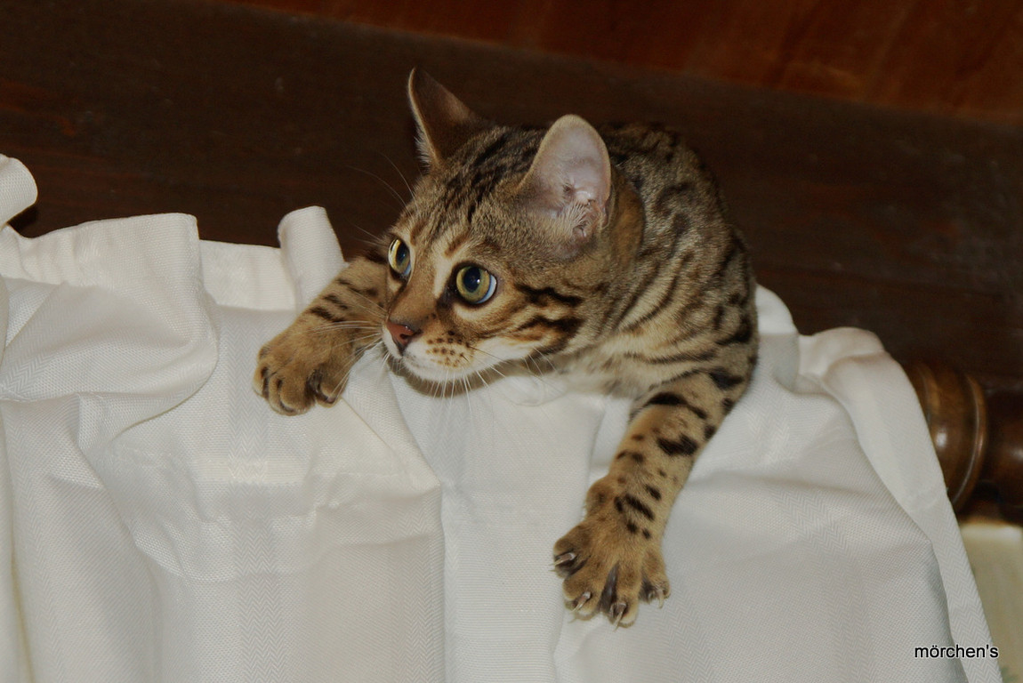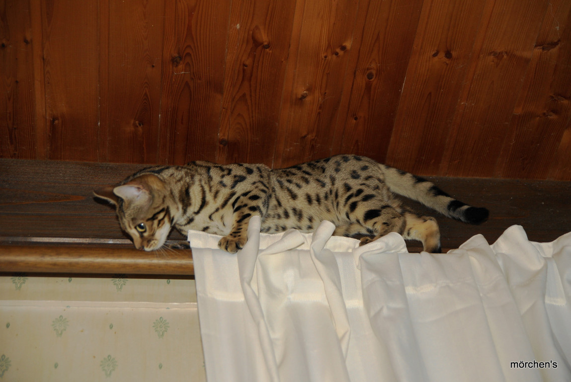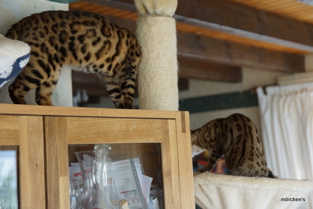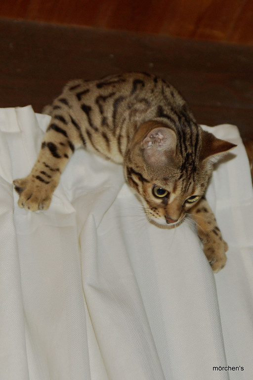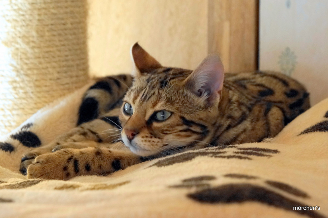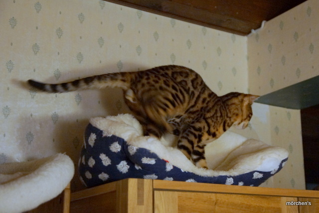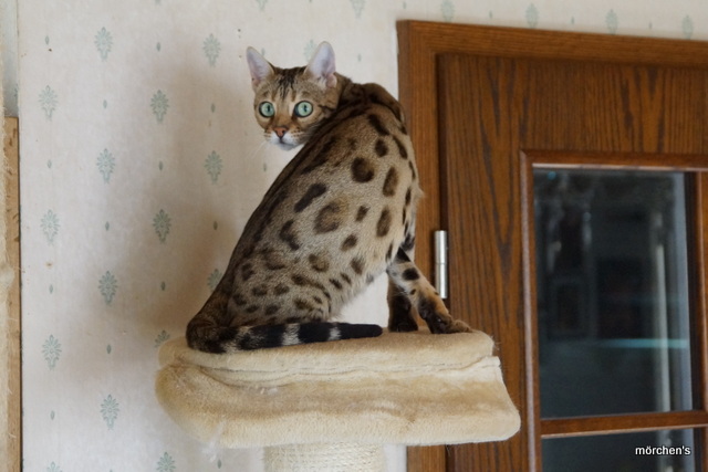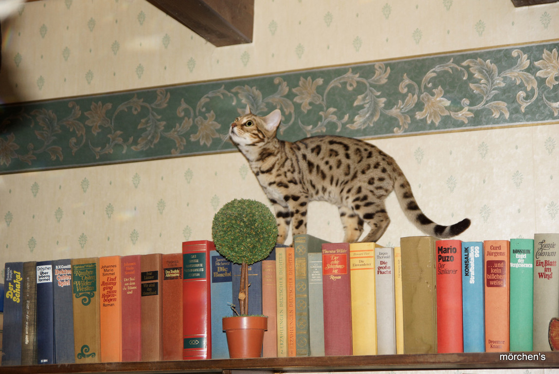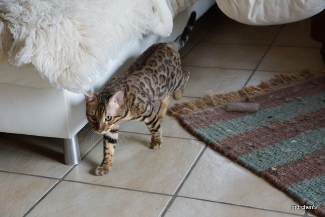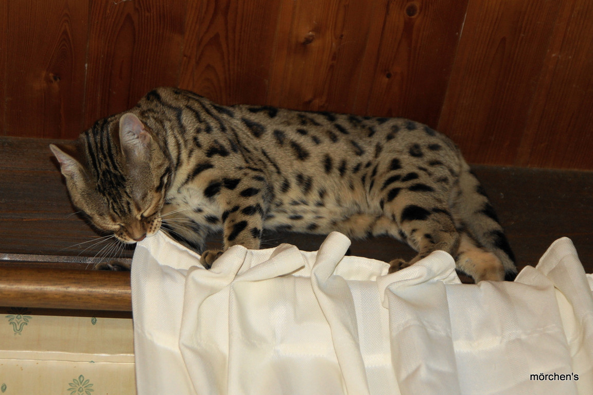 Unsere Fondation Bengalkatze F4 ist im Alter von 14 Wochen zu uns gekommenund. Sie lebt und spielt mit den anderen Hauskatzen zusammen.