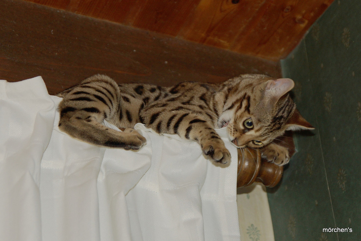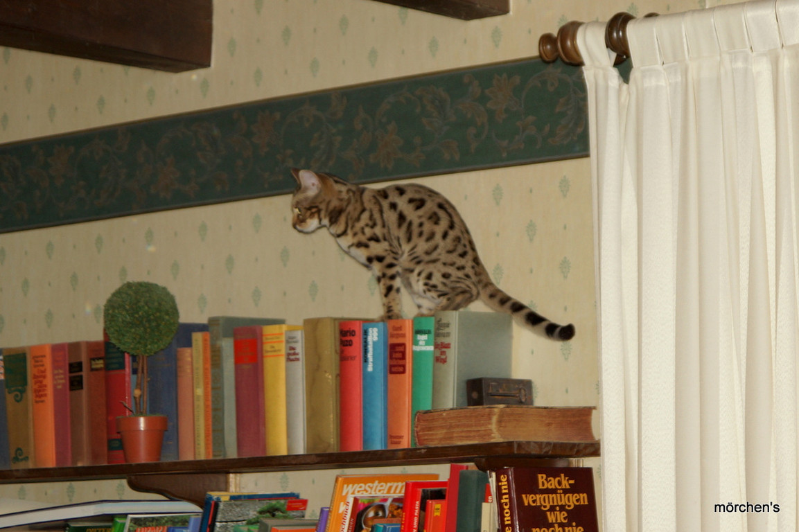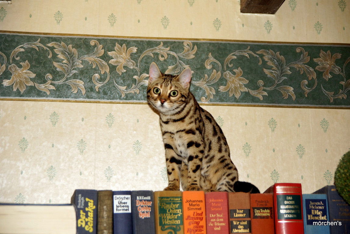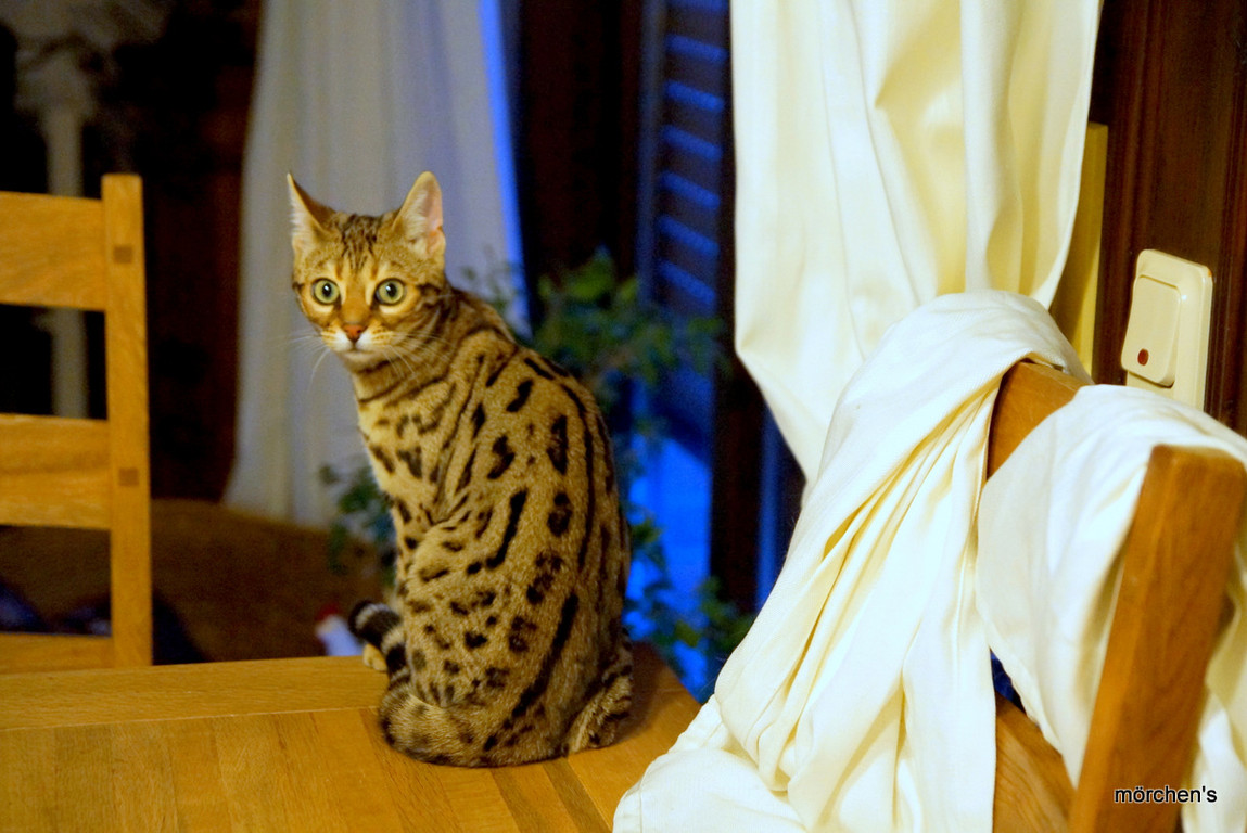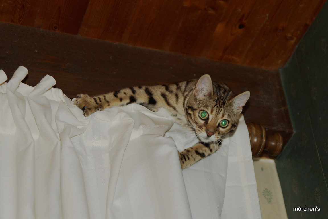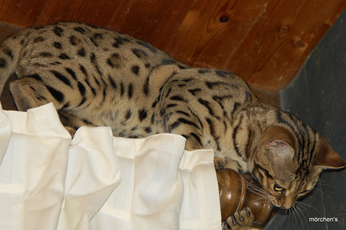 Unsere Fondation Bengalkatze F4 ist im Alter von 14 Wochen zu uns gekommenund. Sie lebt und spielt mit den anderen Hauskatzen zusammen.